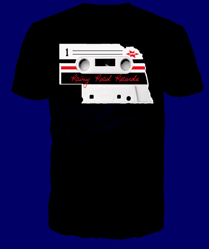 Rainy Road Records Nebraska "Cassette" Logo T-Shirt. Designed by Benjamin Allen Pavlicek and printed at Grindstone Ink, Omaha, NE. T-shirts are printed TO ORDER.